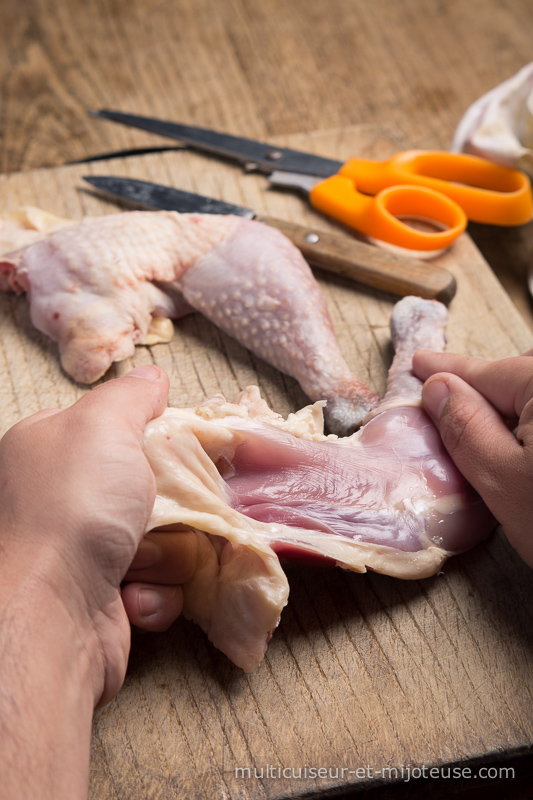 Encore plus facile si vous mettez les cuisses de poulet 1h au congélateur avant de retirer la peau