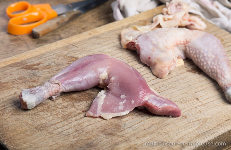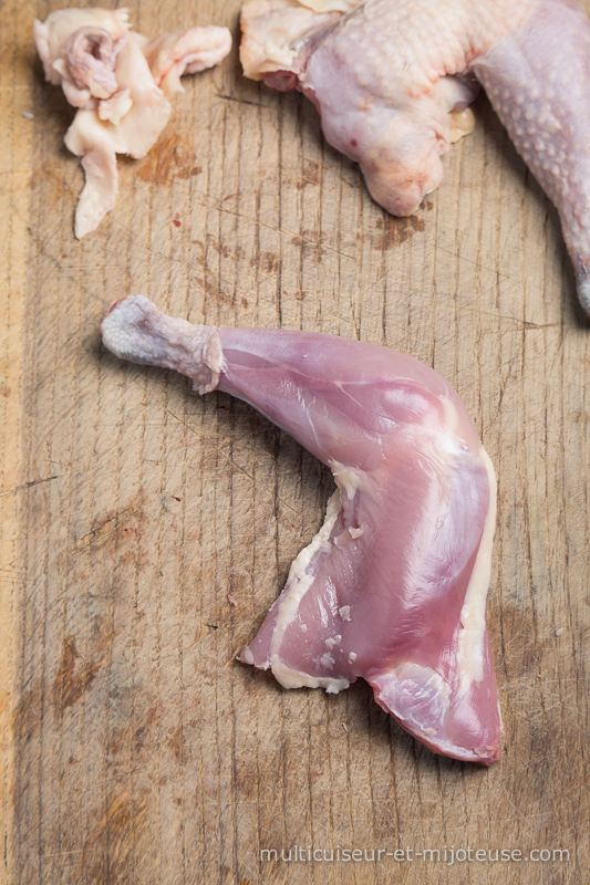 Pour la cuisson au multicuiseur, il m’arrive de retirer la peau des cuisses de poulet car je trouve que la peau c’est bon quand c’est grillé et croustillant, mais que quand c’est mijoté pendant 1 heure, c’est fade et mou.