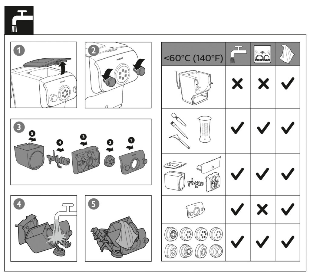 - Désassemblez la façade, le disque de forme, le support de disque, la spatule de mélange et le compartiment de mélange dans l’ordre.