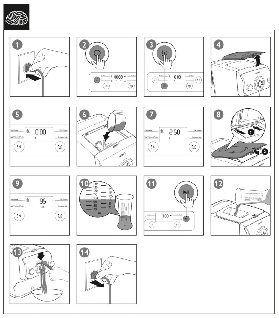 Appuyez sur le bouton marche/pause pour démarrer le processus de fabrication des pâtes. La machine à pâtes commencera par mélanger les ingrédients pour former la pâte, puis elle passera à l’extrusion des pâtes. Suivez les instructions affichées sur l’écran et utilisez le coupe-pâtes fourni pour couper les pâtes à la longueur souhaitée.