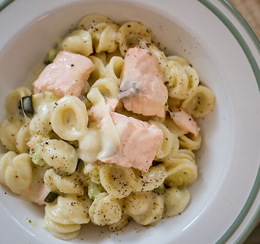 Pourquoi mettre le saumon que à la fin ? Uniquement pour qu’il reste très tendre car le saumon n’a pas besoin de 10 minutes pour cuire.