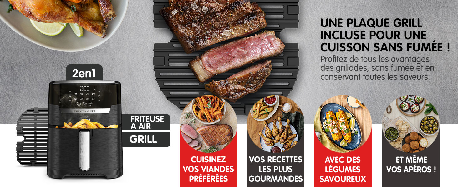 - Technologie 2-en-1 : La friteuse sans huile et le grill sont combinés dans un seul appareil, ce qui permet une polyvalence maximale en cuisine.